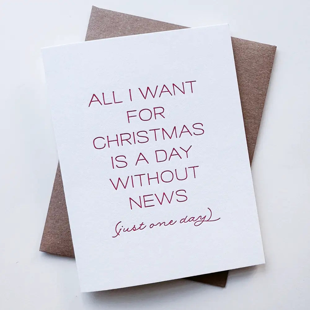 A very timely holiday wish for anyone who’s had enough of the headlines. This card delivers a little peace, quiet, and perspective — with a side of dry humor. The perfect card for news-fatigued friends and family.