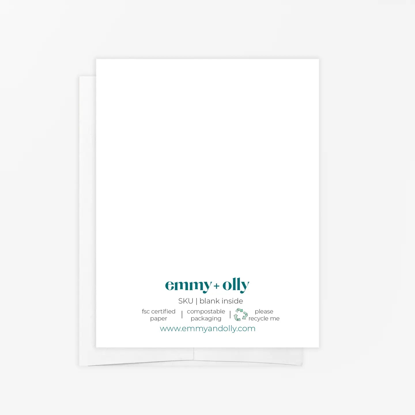 A hand designed water color print on heavy, FSC certified paper + packed in compostable packaging made from wood pulp - 4.25 x 5.5'' folded card, blank inside paired with a white envelope.