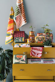 - Fantastical florals burgeon with folk art flair. Exuberant lines and textures are arranged in unexpected symmetry while rich ochre and burgundy frolic with soft pink and green, mimicking the duality of nature’s fierce beauty.